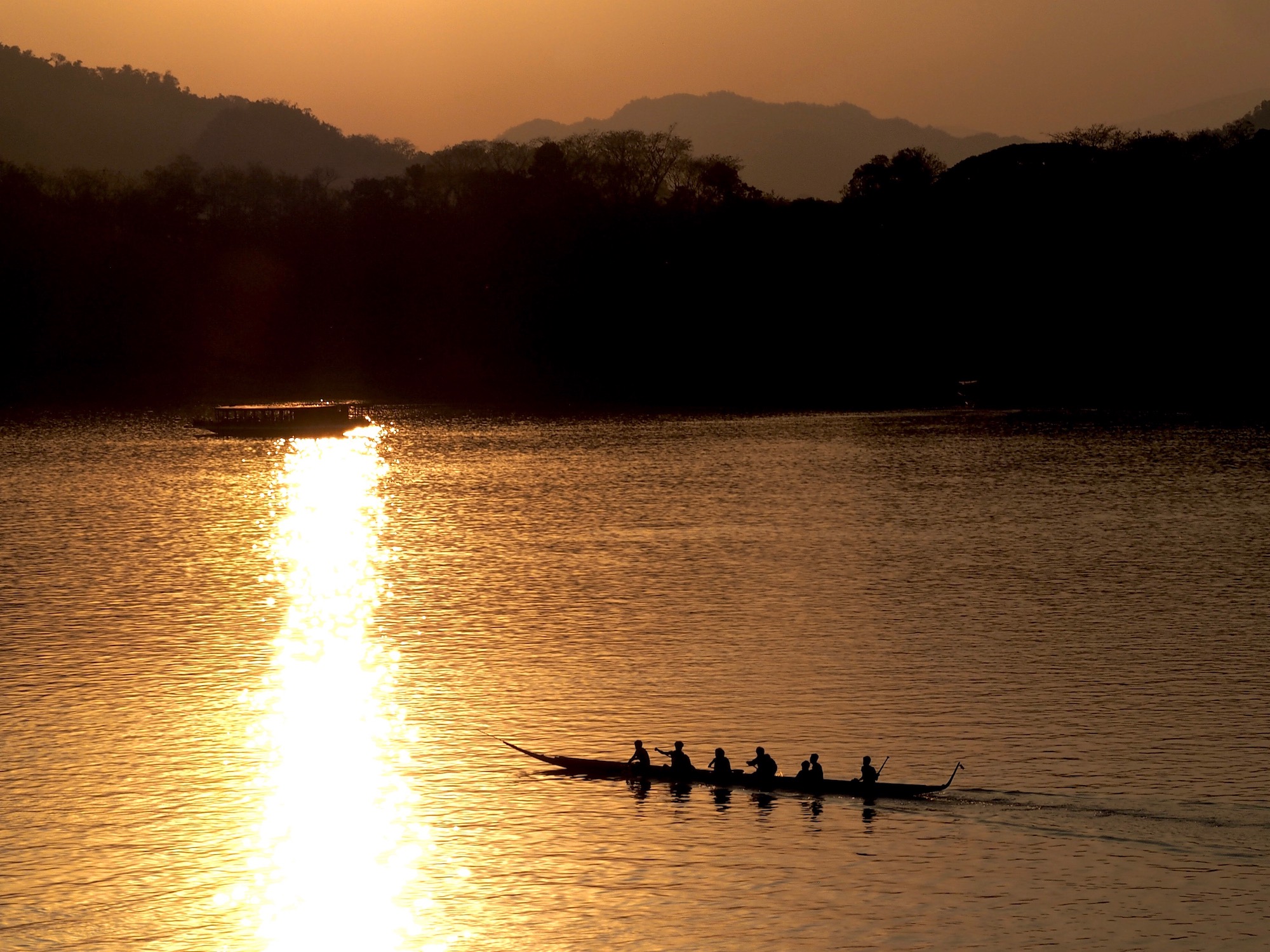 Ich bin sehr froh, dass es dieses Jahr geklappt hat und Eddy mich in den nächsten Wochen begleiten wird. Wir kämpfen beide noch mit dem Jetlag, genießen aber trotzdem unsere ersten Eindrücke bei einem Spaziergang durch die Stadt und landen zum Sonnenuntergang an einer der zahlreichen Gaststätten am Mekong. Diverse Boote starten nach und nach, um Urlauber zur goldenen Stunde auf das Wasser zu bringen. Wir genießen das Schauspiel und schauen der Sonne bei ihrem Sinkflug zu, bis sie schließlich hinter den Karstbergen für heute verschwindet, nicht ohne vorher Himmel und Fluss großzügig golden zu illuminieren. Für uns wird es Zeit auf dem Nachtmarkt nach ein paar Köstlichkeiten zu suchen.