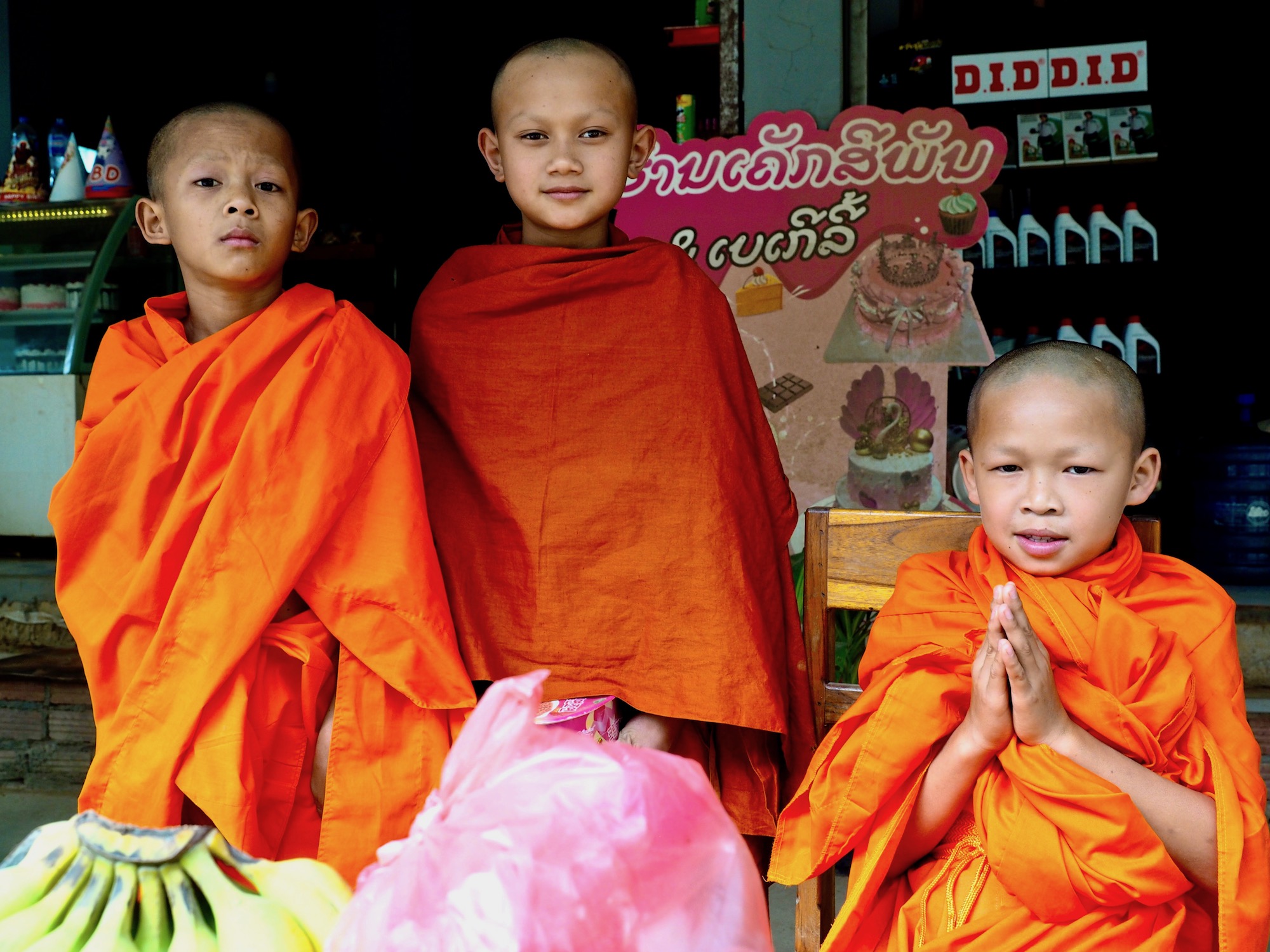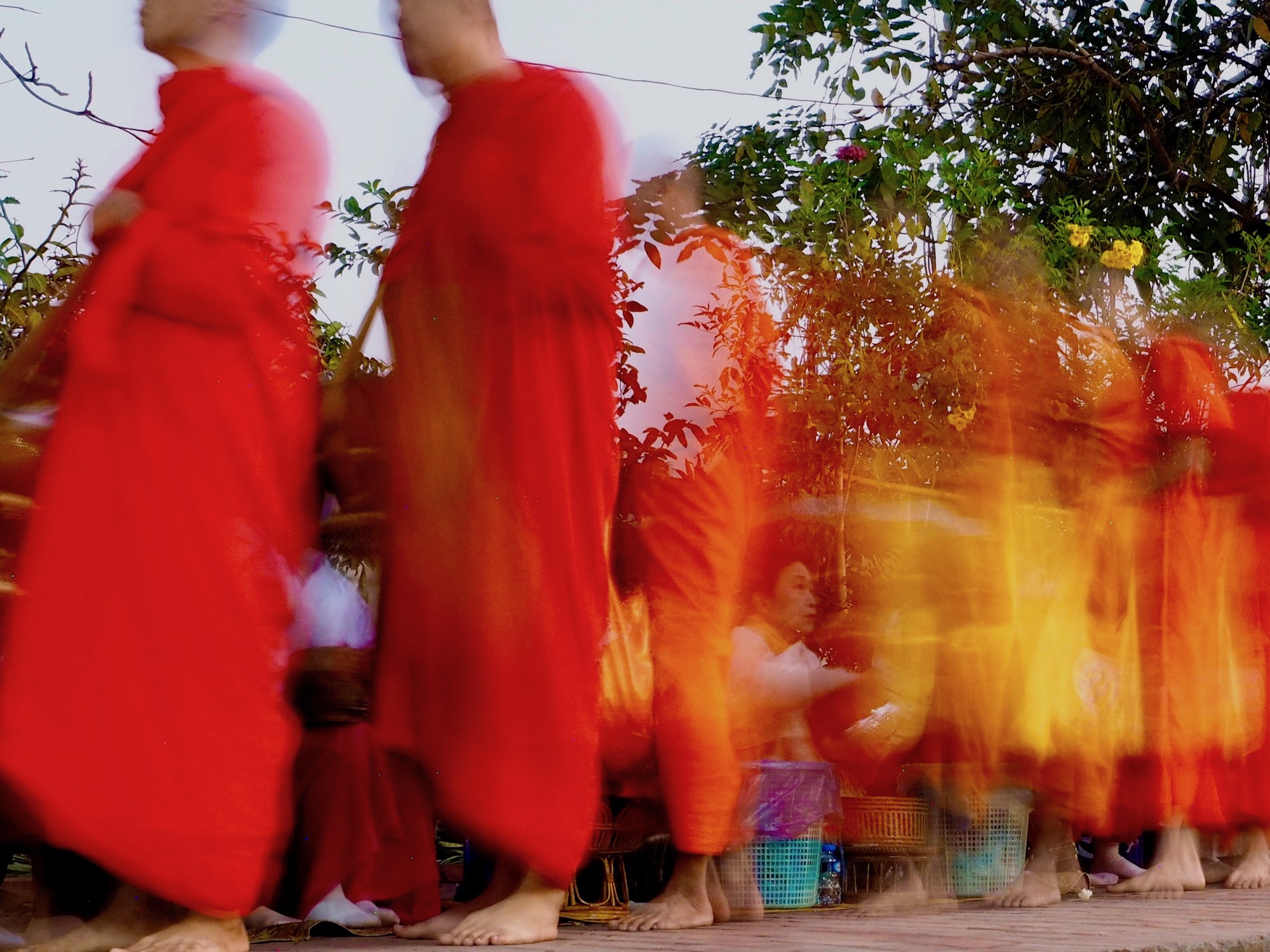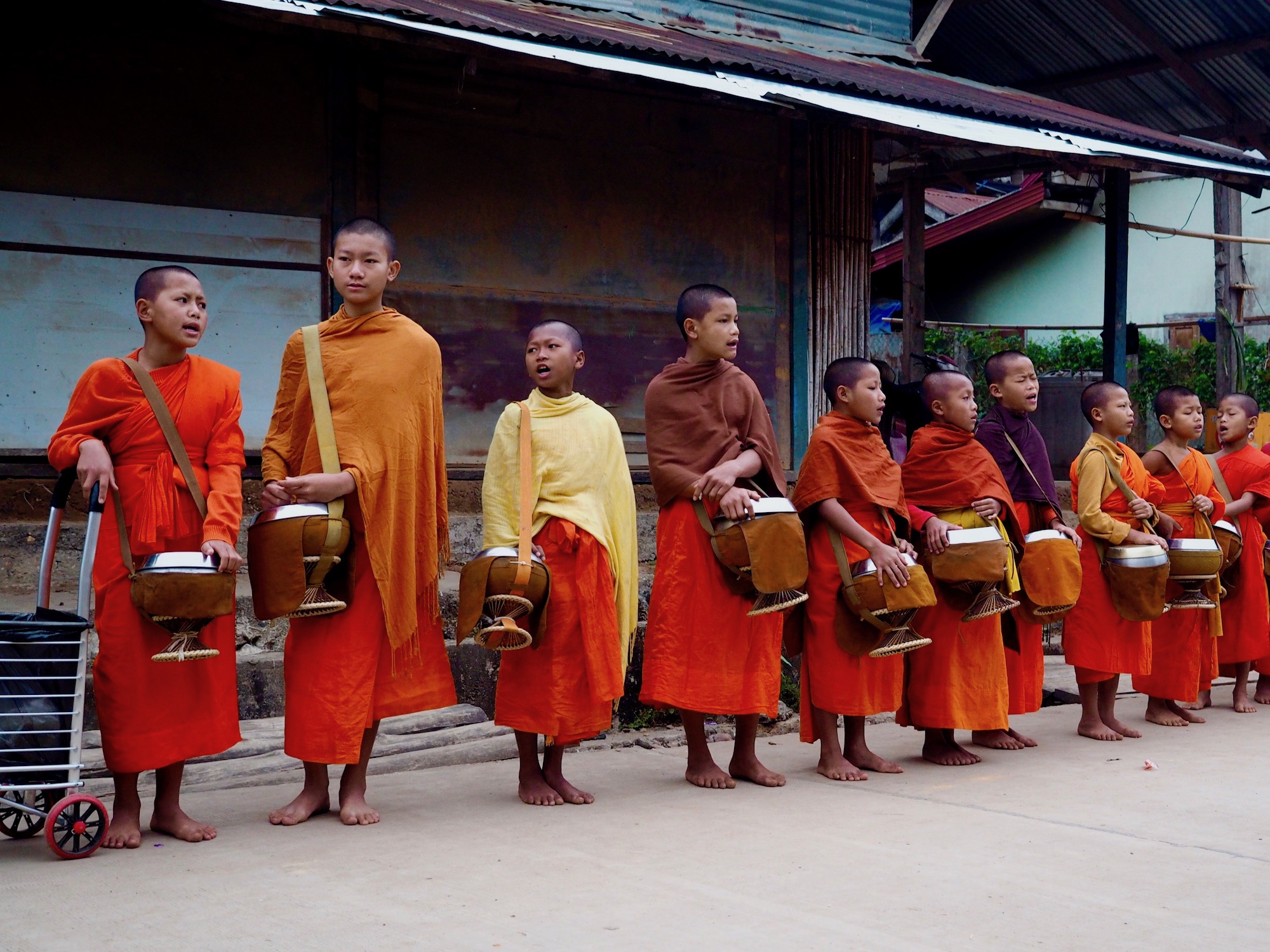 Am Morgen werde ich früh wach und höre eine Trommel schlagen. Ich ziehe mich schnell an und bin pünktlich zum Tak Bat, dem Almosengang der Mönche vor der Tür. Hier sind es genauso viele wie in Luang Prabang, aber nur ein paar einheimische Frauen und zwei Männer sitzen auf ihren kleinen Schemeln oder knien auf Teppichen und verteilen ihre gerollten Reisklumpen in die Töpfe der Mönche. In den leuchtend orangen Kutten stecken ausschließlich Kinder und Jugendliche. Der letzte Mönch zieh einen Hackenporsche hinter sich her, in den größere Gaben untergebracht werden. Einer der beiden Männer am Rand verteilt Tausend Kip Scheine. Frauen müssen generell knien oder sitzen, während Männer auch stehen dürfen, aber auch sie sollen den Kopf immer tiefer halten als der Mönch. Alle hundert Meter stoppt der Zug und die Gruppe chantet für eine Weile. Außer mir sind noch fünf Touristen anwesend. Die ganze Zeremonie strahlt hier die ihr inneliegende Würde aus. Auf der Hälfte der Strecke treffen die Mönchsgruppen der beiden Kloster aufeinander und jede Gruppe zieht weiter bis zum Ende ihres Weges. Der Rückweg erfolgt dann ungeordnet und die Bedächtigkeit ist Gesprächen gewichen. Ein paar der Frauen betten noch unter dauerndem Kopf senken. Kurze Zeit später übernehmen aber die weltlichen Bedürfnisse wieder ihre Hauptrolle: Es wird gebraten und gekocht, Feuer werden geschürt, die Läden öffnen und der Tag beginnt seinen Lauf zu nehmen.
