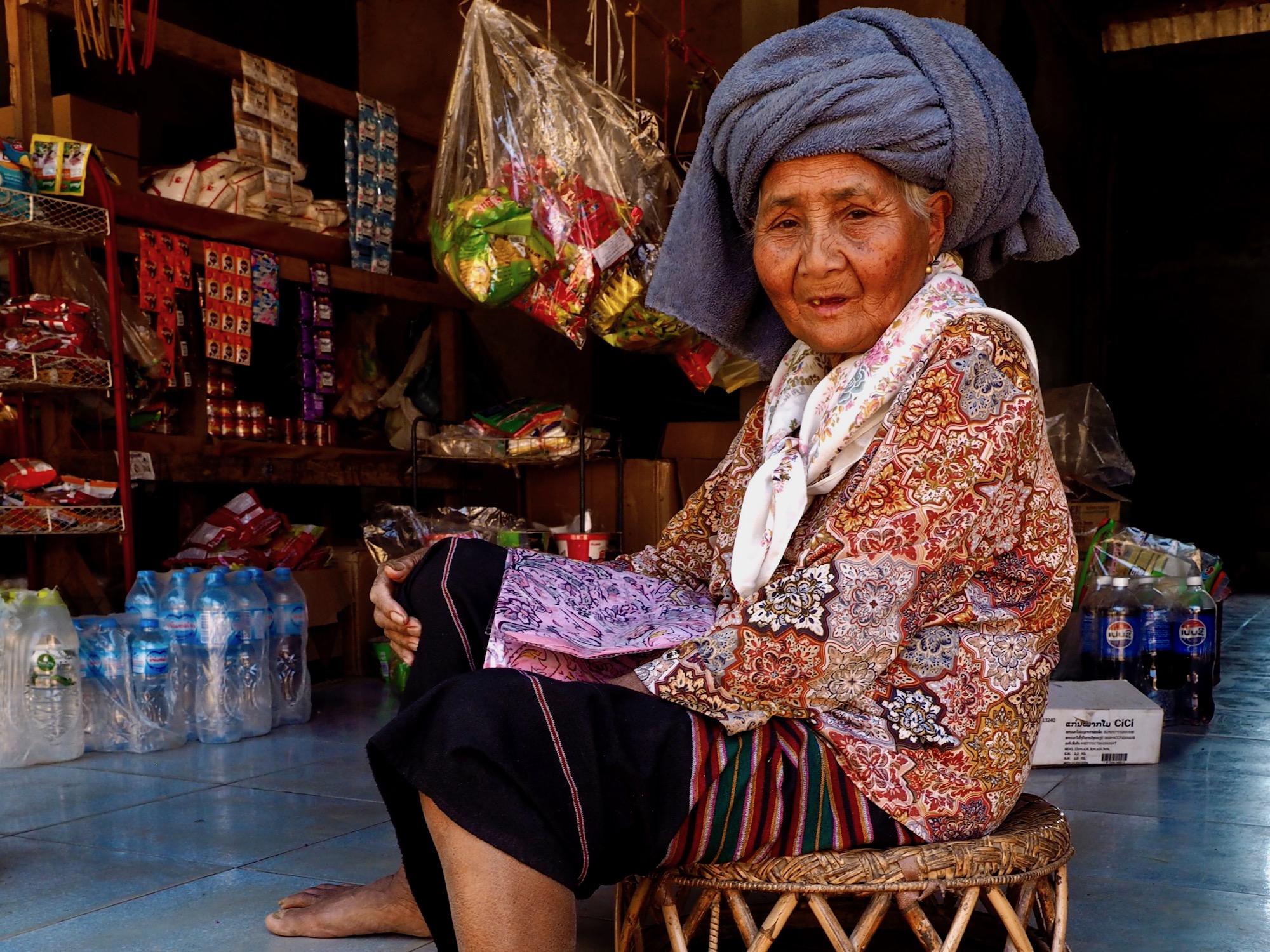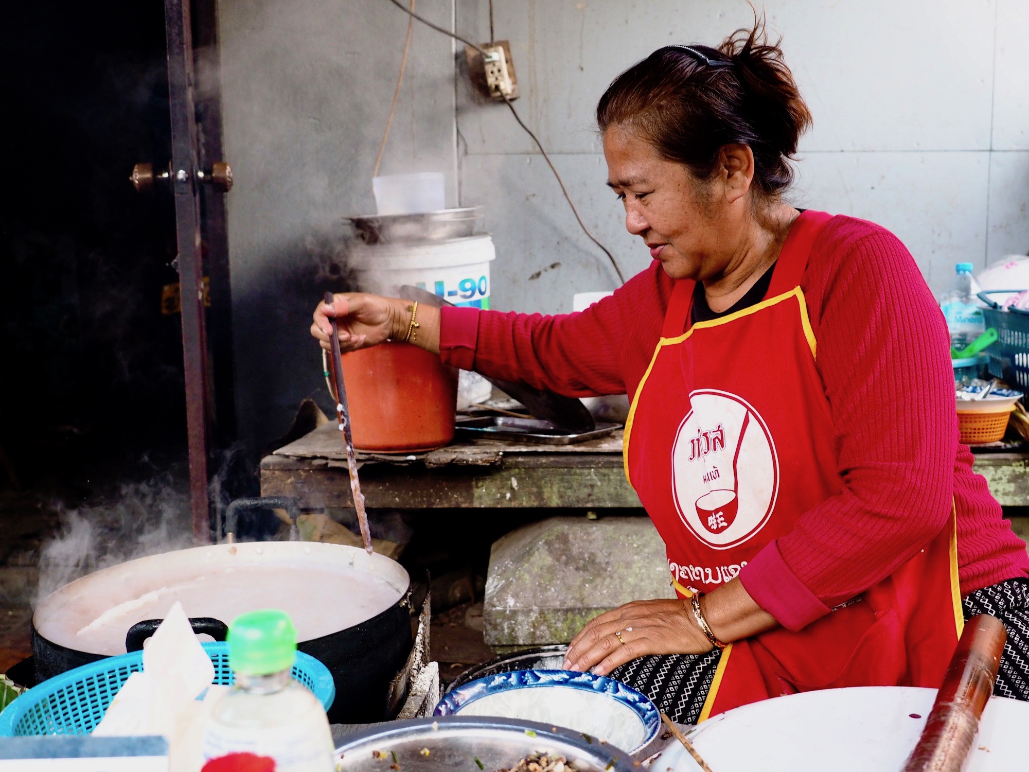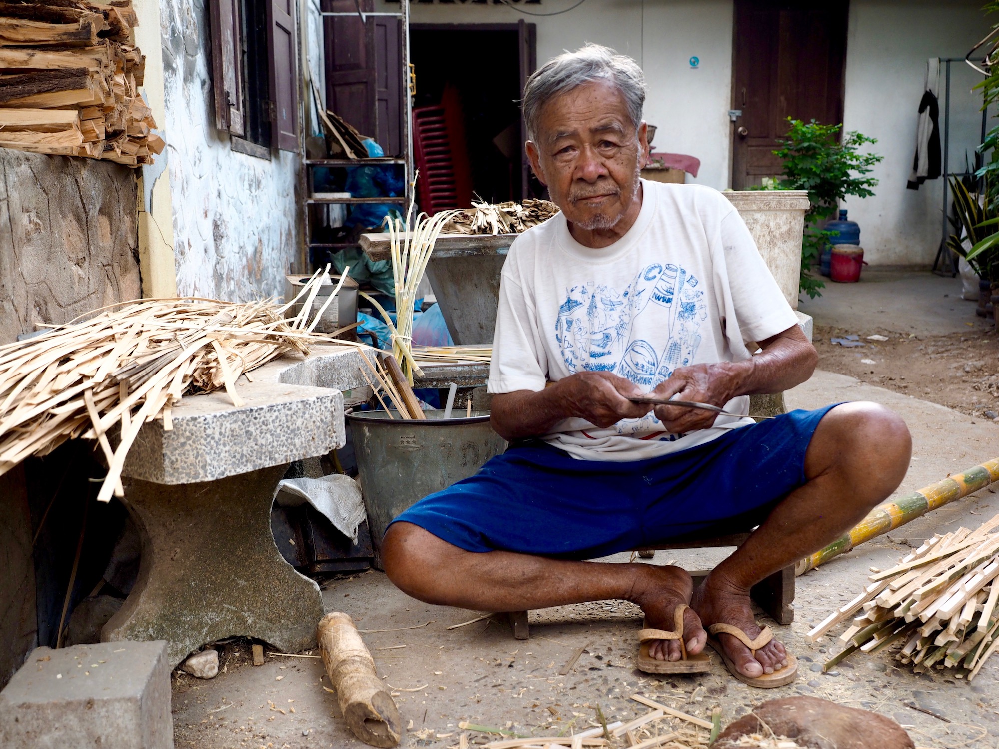 Am Morgen werde ich früh wach und höre eine Trommel schlagen. Ich ziehe mich schnell an und bin pünktlich zum Tak Bat, dem Almosengang der Mönche vor der Tür. Hier sind es genauso viele wie in Luang Prabang, aber nur ein paar einheimische Frauen und zwei Männer sitzen auf ihren kleinen Schemeln oder knien auf Teppichen und verteilen ihre gerollten Reisklumpen in die Töpfe der Mönche. In den leuchtend orangen Kutten stecken ausschließlich Kinder und Jugendliche. Der letzte Mönch zieh einen Hackenporsche hinter sich her, in den größere Gaben untergebracht werden. Einer der beiden Männer am Rand verteilt Tausend Kip Scheine. Frauen müssen generell knien oder sitzen, während Männer auch stehen dürfen, aber auch sie sollen den Kopf immer tiefer halten als der Mönch. Alle hundert Meter stoppt der Zug und die Gruppe chantet für eine Weile. Außer mir sind noch fünf Touristen anwesend. Die ganze Zeremonie strahlt hier die ihr inneliegende Würde aus. Auf der Hälfte der Strecke treffen die Mönchsgruppen der beiden Kloster aufeinander und jede Gruppe zieht weiter bis zum Ende ihres Weges. Der Rückweg erfolgt dann ungeordnet und die Bedächtigkeit ist Gesprächen gewichen. Ein paar der Frauen betten noch unter dauerndem Kopf senken. Kurze Zeit später übernehmen aber die weltlichen Bedürfnisse wieder ihre Hauptrolle: Es wird gebraten und gekocht, Feuer werden geschürt, die Läden öffnen und der Tag beginnt seinen Lauf zu nehmen.