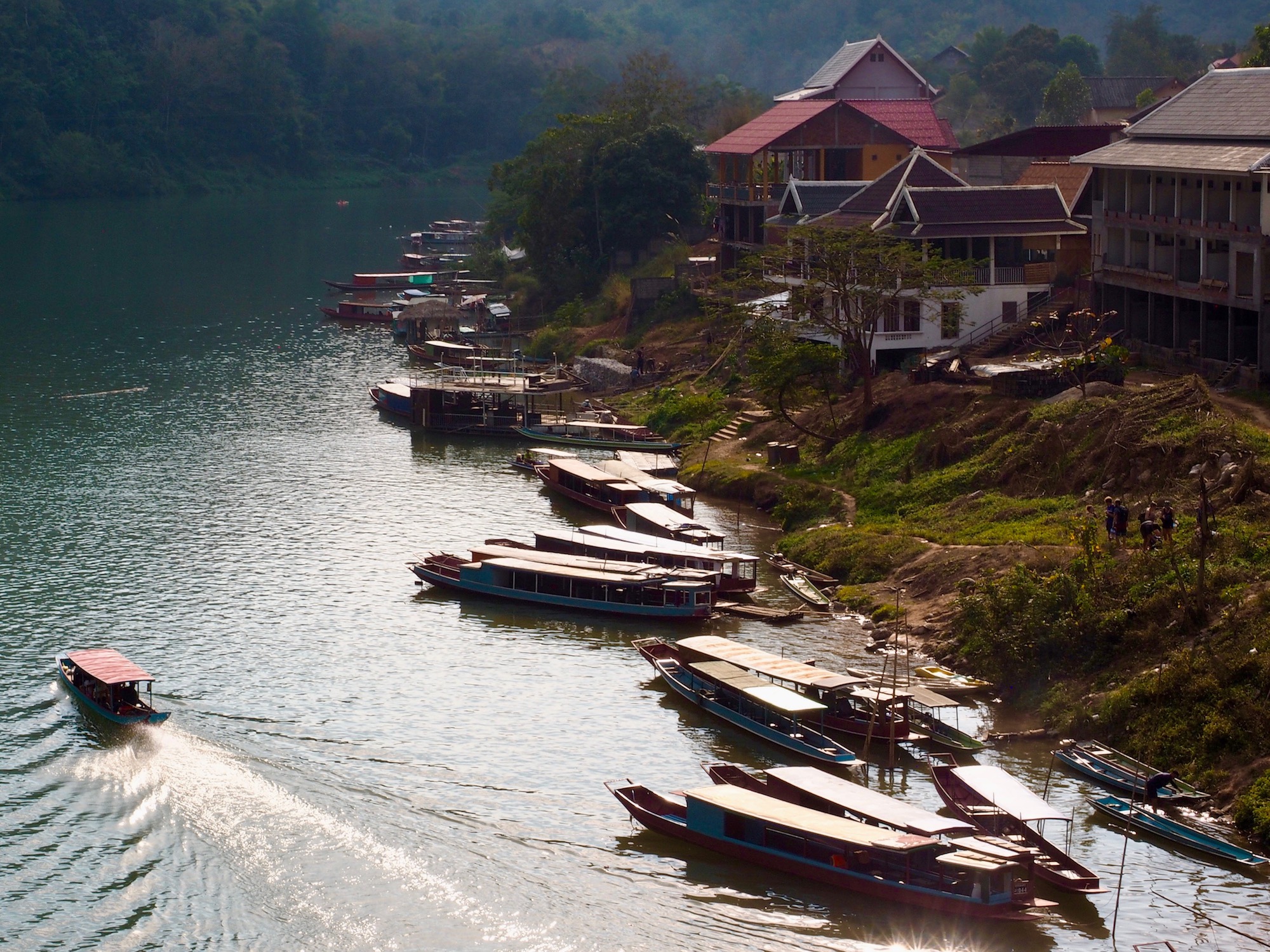 Am Morgen spazieren wir nach dem Frühstück mit unserem Gepäck zur Anlegestelle der Fähre nach Muang Ngoi. Wir kaufen unser Ticket, trinken noch ein Soda und warten auf die Ankunft des Bootes. Es sind schließlich so viele Fahrgäste, dass zwei weitere der typischen kleinen Kähne angeheuert werden. Der ganze Vorgang ist leicht chaotisch und dauert dementsprechend lange. Immerhin werden aber die Boote nicht überladen, das Gepäck kommt nach vorne hinter das Fahrerhaus, dann folgen vier Reihen mit jeweils links und rechts einem bequemen Sitz und dahinter zwei hölzerne Längsbänke für weitere zehn Passagiere. Nach einer halben Stunde fahren wir los und es geht stromaufwärts auf dem Nam Ou. Es ist friedlich hier auf dem Fluss, kaum ein anderes Boot ist unterwegs. Zu beiden Seiten ragen die Berge wie Zuckerhüte auf. An den Hängen noch Wald, in den flacheren Stücken oft schon Plantagen. Im Wasser liegen Wasserbüffelfamilien und käuen wieder. Der Fahrtwind lässt uns die kleine Reise genießen, bis nach einer halben Stunde der Bootsführer nervös wird und immer wieder nach hinten schaut. Schließlich fährt er vorsichtig auf eine Sandbank und steigt aus, um nach hinten zum Motor zu gehen. Er verschwindet kurz im Motorraum, kommt wieder und die Fahrt geht erst einmal weiter. Leider hat sich das Problem aber nicht erledigt und so fahren wir zwei weitere Male ans Ufer. Das dritte Boot überholt uns und die beiden Kapitäne tauschen sich aus. Letztendlich schaffen wir es mit einigen Motoraussetzern bis nach Muang Ngoi. Wir laden das Gepäck auf den kleinen Plastik-Ponton aus und gehen dann die Treppe hinauf ins Dorf. Einige Frauen bieten Zimmer an, wir haben jedoch schon vorgebucht und checken in unserem Gasthaus ein. Der Ort lebt ebenfalls vom Tourismus, ist aber noch einmal wesentlich ruhiger als Nong Khiaw. Da es nur eine Lehmpiste hierher gibt, sind kaum Autos und nur ein paar Roller zu sehen. Die Ruhe ist wunderbar und die Lage am Fluss mit den umgebenden Bergen ist es auch. Der betonierte Hauptweg führt einmal vom Kloster an einer Reihe von Läden und Restaurants vorbei zum Kloster an der anderen Seite. Links und rechts zweigen nichtasphaltierte Wege ab zu den Häusern und Ställen. Eddy entdeckt nach dem Essen eine laute Hochzeitsparty und ich mische mich noch unter die Feiernden. Ein großes buntes Dach in der Mitte wird von einem Dutzend weißen Pavillions umgeben. Vorne steht eine Bühne, auf der eine Sängerin die Tanzwütigen anheizt. An den Tischen unter den Pavillions wird gegessen und viel getrunken. Um drei Uhr nachmittags scheint ein guter Teil des Publikums schon so gut wie hinüber. Beerlao steht in zahlreichen Kästen an jedem Tisch und das Bier wird fast immer geext. Jemand öffnet eine Flasche und schenkt den umstehenden ein. Einige müssen schon gestützt werden und so mancher Blick ist nicht mehr stabil. Auf die Tanzfläche wirkt sich das recht dynamisch aus. Es wird sehr ausgiebig und enthusiastisch getanzt. Auch ein paar Reisende freuen sich am Fest und sind eifrig dabei. Ein junger Mann wird auf seinem Stuhl in die Luft gehoben und johlend von seinen Freunden herumgetragen. Ältere Männer können kaum noch stehen, Frauen ziehen andere Frauen an ihrer Kleidung auf die Tanzfläche. Ich ziehe mich nach einer Stunde und zwei Bierchen zurück, betrachte die Szenerie noch ein wenig aus der Entfernung und überlasse die Feier den Feiernden.