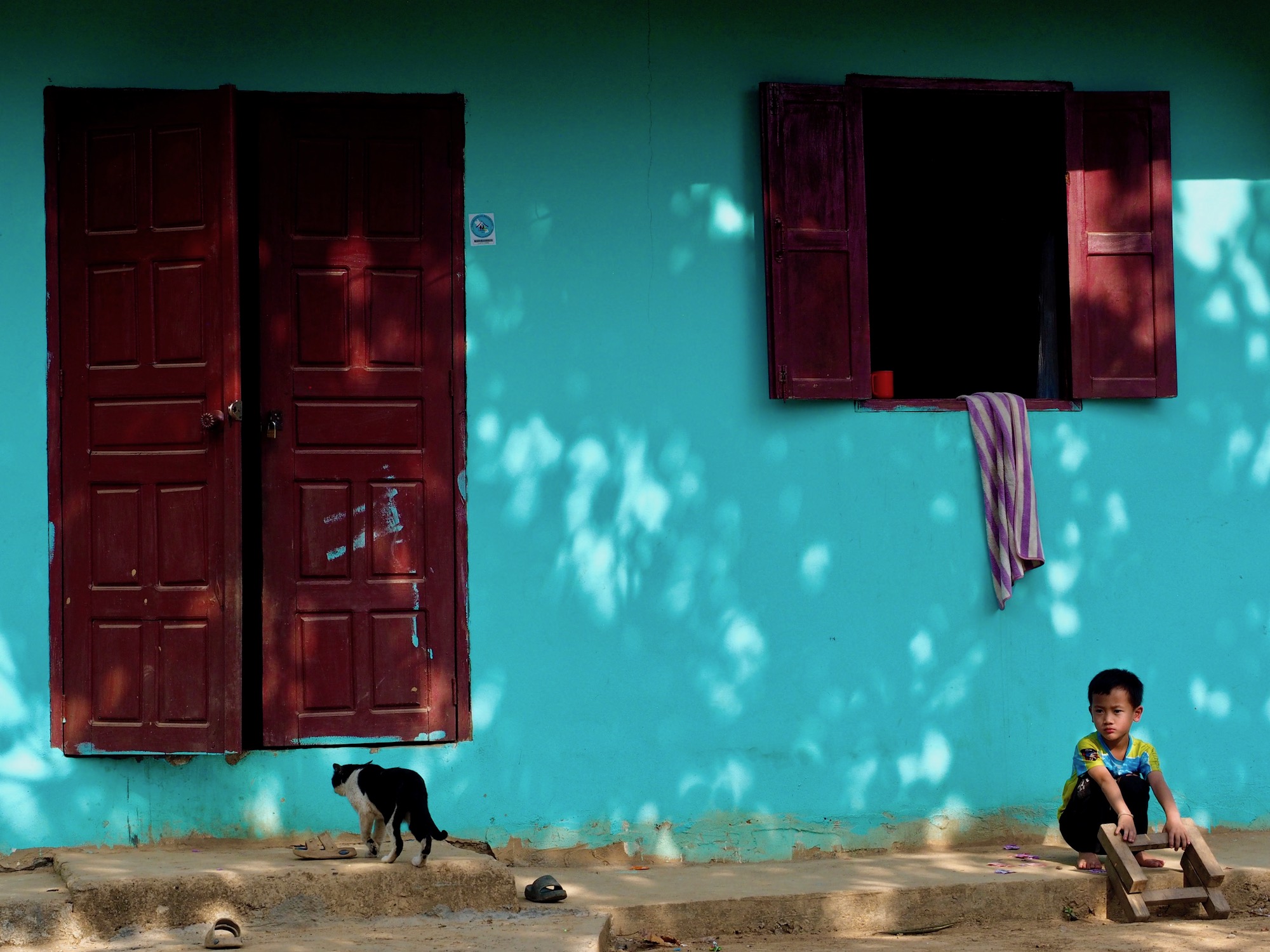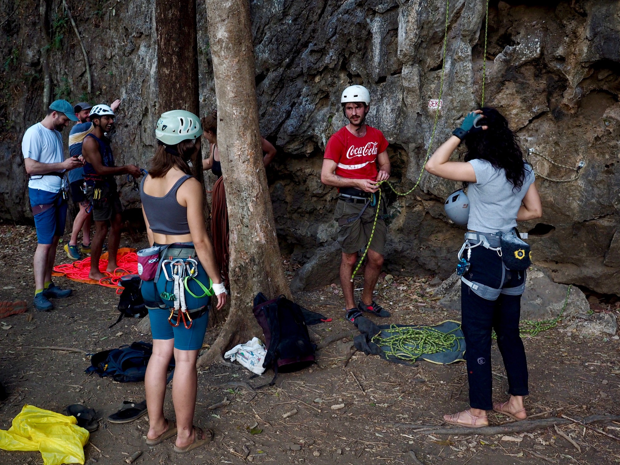 Wenn Eddy weiter oben in der Wand klettert, schwebe ich in einer geteilten Gefühlswelt. Auf der einen Seite überwiegt die Freude über seinen Eifer und der Lust an neuen Aufgaben. Aber auch die Angst vor einer schweren Verletzung oder dem Tod schwingt mit. Vor einigen Tagen ist hier im Tal eine südkoreanische Kletterin gestorben. Sie war mit ihrer Partnerin aus Thakhek als Tagesgast gekommen, keiner kannte sie vorher. Ein Sturz aus sechs Metern Höhe hat gereicht, um ihr Leben auszulöschen. Die Vorstellung, mit solch einem Unglück leben zu müssen, schnürt mir die Kehle zu. Aber natürlich kann jeden Tag etwas Tragisches passieren und meine Aufgabe als Vater besteht darin, Eddy möglichst angstfrei, aber Risiken gut einschätzend hinaus in sein Leben zu schicken. Es war meine Idee hierher zu kommen und er hat seitdem in Boulder-Hallen Technik und Ausdauer geübt. Hier werden ihm nun die nötigen theoretischen und praktischen Kniffe gezeigt, um in diesem Sport weiterzukommen. Was mir daran gefällt ist, dass jede Route eigene Probleme mit sich bringt und es oft Dutzende Anläufe braucht diese zu lösen. Es ist ein hervorragendes Training für Körper und Gehirn.