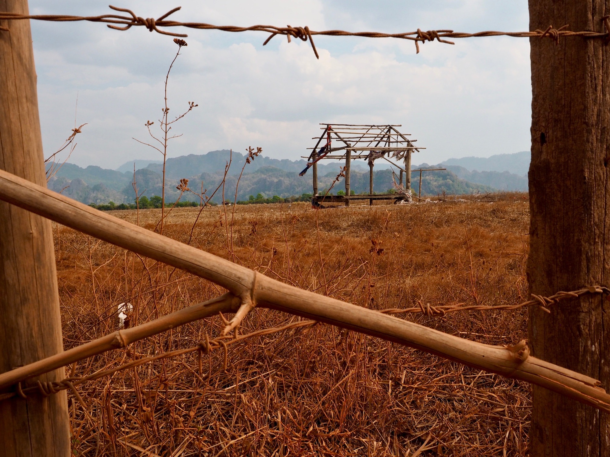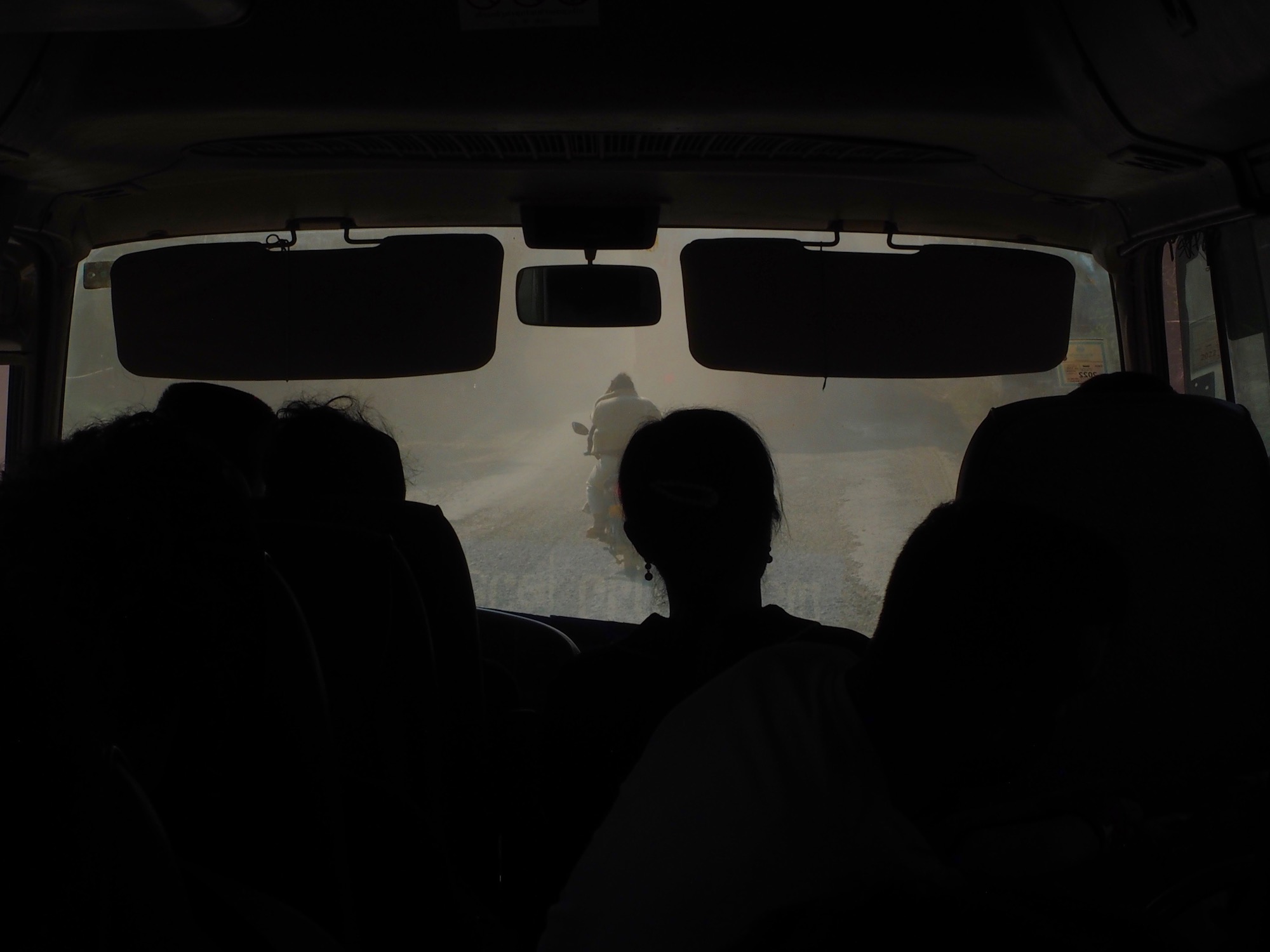 Unser zweiter Tag führt uns längere Zeit entlang schmaler Finger und größerer Einbuchtungen des Tam Theun. Es ist ein seltsamer Anblick, weil die Bäume nicht vor dem anstauen des Sees gefällt wurden und nun zu Hunderten als kahle Stämme aus dem Wasser ragen. Eine Gruppe Rollerfahrer steht auf der anderen Straßenseite. Eine junge Frau wird von Mitreisenden verarztet. Eigentlich keine Stelle für einen Unfall, wahrscheinlich sind zwei ihrer Roller aneinander gestoßen und haben sich verhakt. Wir passieren die letzten Ausläufer bevor es durch dichten Buschwald und anschließend Bergwald kurvenreich weitergeht. Ein Pavian kreuzt vor uns die Straße und verschwindet im Dickicht. Staubige Straßendörfer lassen wir links liegen, Hunde am Wegesrand und immer wieder winkende Kinder. Schließlich öffnet sich der Blick in ein weites, stark landschaftlich geprägtes Tal tief unter uns. Am Horizont ein einzelner langgezogener Berg. Wir schlängeln uns in das dunstige Tal hinab, immer von Dorf zu Dorf. In Lak Sao sollten wir abbiegen, fahren allerdings stattdessen noch eine Weile geradeaus, bis Eddy stutzig wird und wir nach einem Google Maps Check wieder zurück fahren und schließlich in die richtige Straße einbiegen.