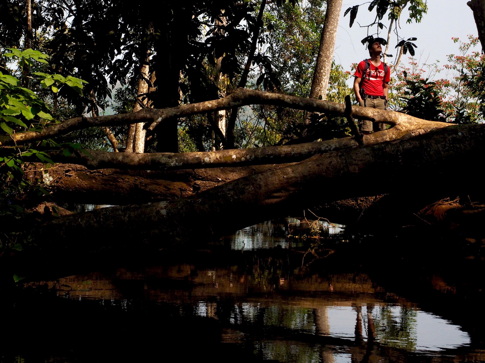 Schon über Nacht lausche ich den Regentropfen auf unserem Dach. Am Morgen ist es dann stark bewölkt und nach dem Frühstück hören wir Donnergrollen in der Ferne. Etwas später startet der Regen. Ein Franzose, der hier an der Kommunikation zwischen Naturpark und Landbevölkerung arbeitet und Konzepte mit den Menschen erstellt, wie eine Akzeptanz der Naturschutzbemühungen mit dem Wohlstand in den Dörfern kombinierbar ist, erzählt mir, dass dieser erste Regen nach der Trockenzeit „mango rain“ genannt wird. Für die nächsten drei Stunden schaue ich, wie dicke Regentropfen auf den Fluss fallen. Die französischen Kinder aus dem Nachbarzimmer entdecken eine Schlange in einem Haufen trocknender großer Blätter. Bei genauem hinsehen entpuppen sie sich sogar als ein ineinander verwobenes etwa anderthalb bis zwei Meter langes Paar. Immer wieder recken sie ihre Köpfe aus den Blättern nach oben. Ich schraube mein Teleobjektiv auf und probiere ein paar schöne Fotos zu schießen. Das fokussieren ist allerdings recht schwer, weil sie sich schnell und dabei nicht linear bewegen und um sie herum der Laubhaufen recht dicht ist. Ob sie sich paaren oder kämpfen ist schwer zu sagen, aber ich denke, dass es eher ein Paarungsritual ist. Zwei Mal werden sie rasend schnell in ihren Bewegungen, fliegen einen halben Meter hoch und fallen wieder zurück. Vielleicht der Höhepunkt ihrer Vereinigung. Später finde ich im Internet ein Foto ihrer Art. Es sind Strahlenottern, so benannt nach den strahlenförmig von ihren Augen abgehenden Streifen. Der Hotelleiter fragt für mich beim Personal nach, die im versichern, dass es ungiftige Exemplare sind.